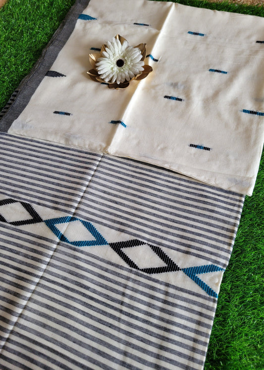 Offwhite And Black Chanderi Block Printed Silk Cotton Saree-Rajasthan