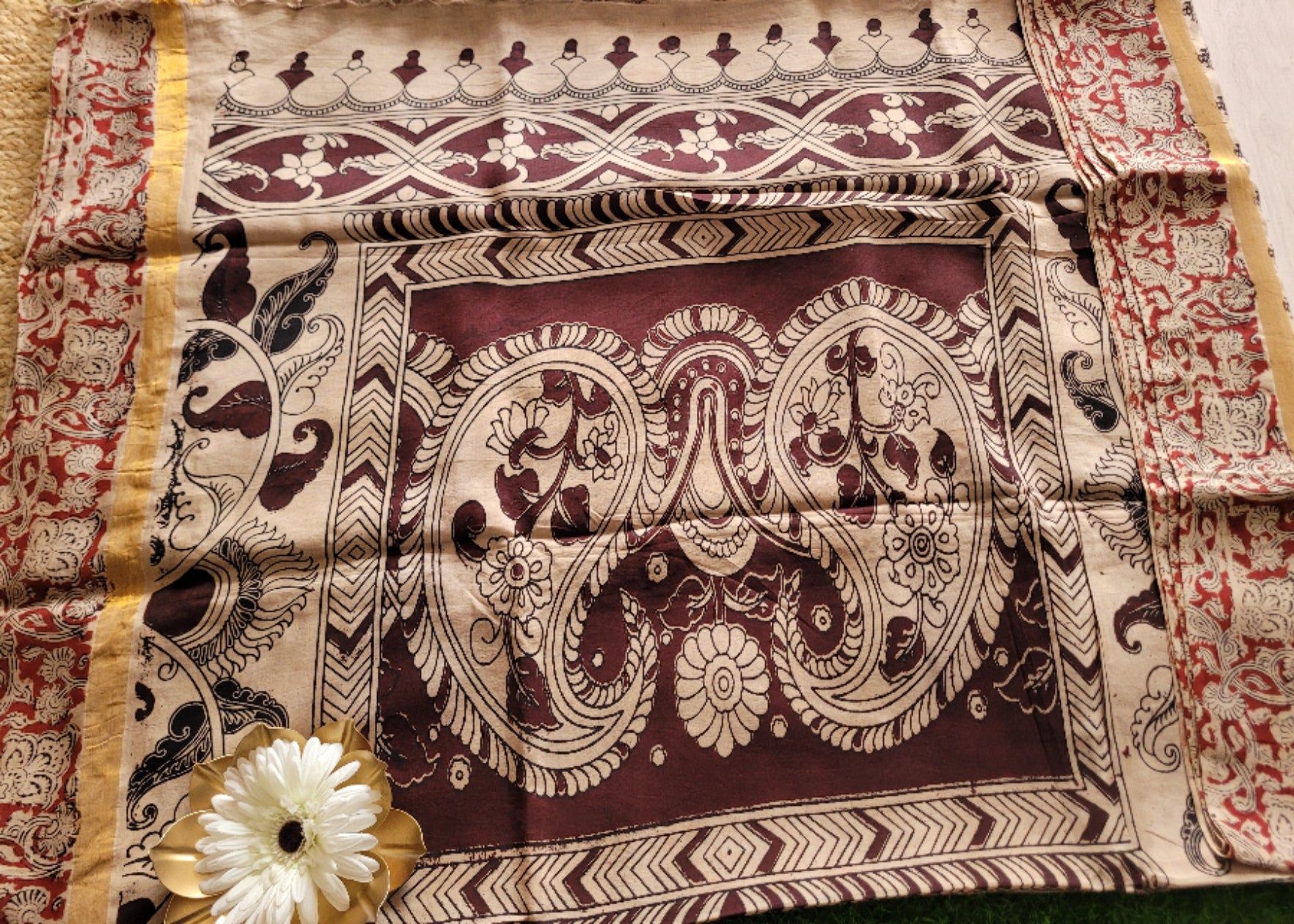 Experience the rich heritage of Andhra Pradesh with this Chennuri Silk Saree in elegant beige base and beautiful and elegant Kalamkari prints. Crafted from silk and cotton,, it offers a traditional feel and elegant look that enhances your formal or casual look. Perfect for cultural events and special occasions, this saree blends timeless artistry with refined comfort, making it an essential addition to your wardrobe for graceful sophistication.