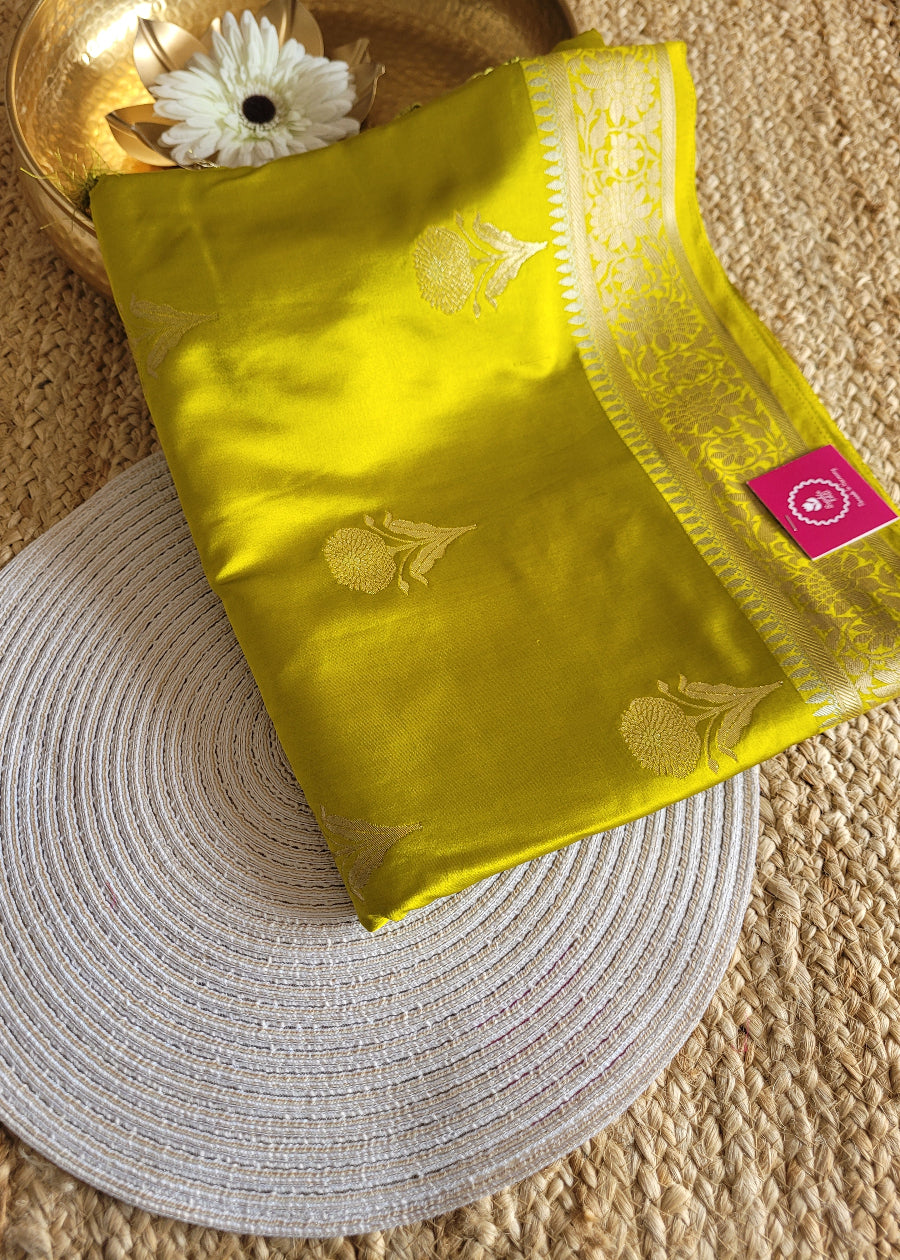 Elevate your festive wardrobe with this Banarasi Mushru Silk Saree in bright Greenish Yellow. Crafted from smooth and satin finish silk, it offers a graceful drape and comfortable wear. The harmonious blend of soft and bold hues, combined with intricate Banarasi weaving, creates a stunning look perfect for weddings and special occasions. Make a lasting impression with this elegant saree that beautifully balances tradition and contemporary style.