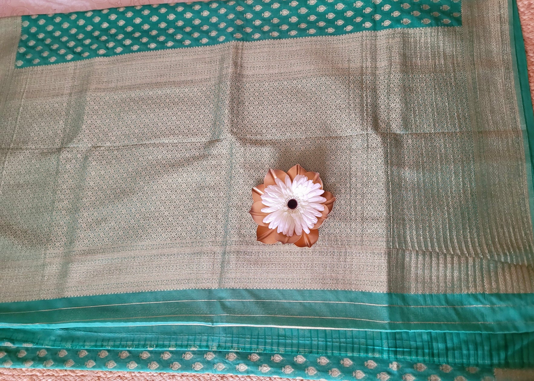 Elevate your festive wardrobe with this Banarasi Georgette Saree in an elegant Rama Green colour. Crafted from semi Georgette, it offers a graceful drape and comfortable wear. The harmonious blend of soft and bold hues, combined with intricate Banarasi weaving, creates a stunning look perfect for weddings and special occasions. Make a lasting impression with this elegant saree that beautifully balances tradition and contemporary style.