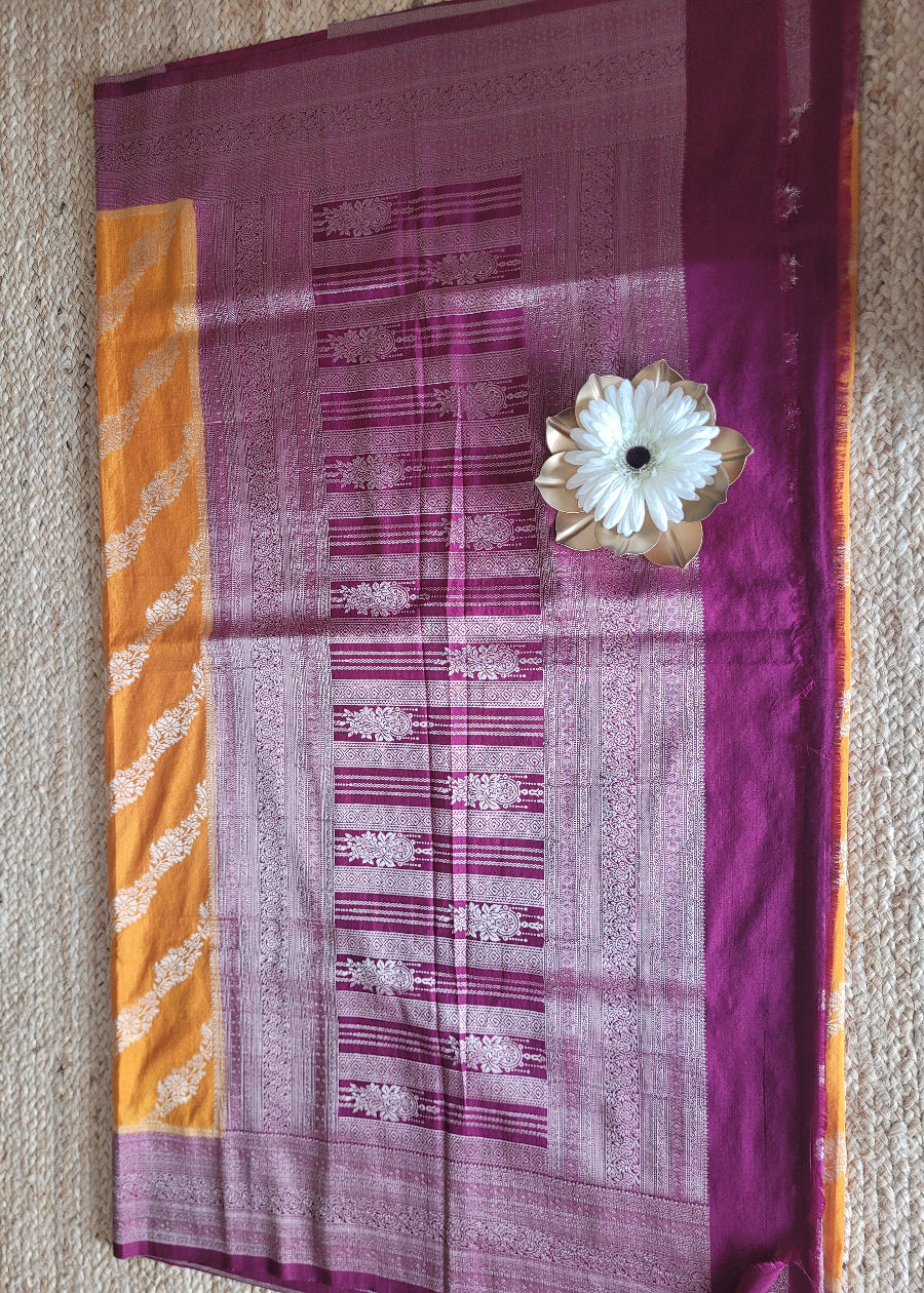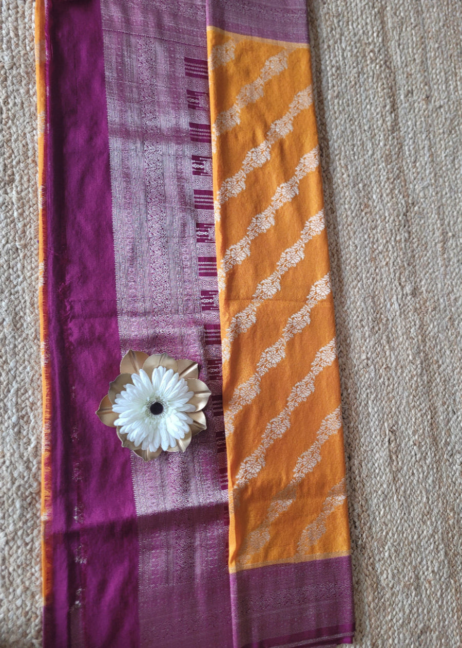 Mustard Yellow And Maroon Tussar Silk Saree- Banaras