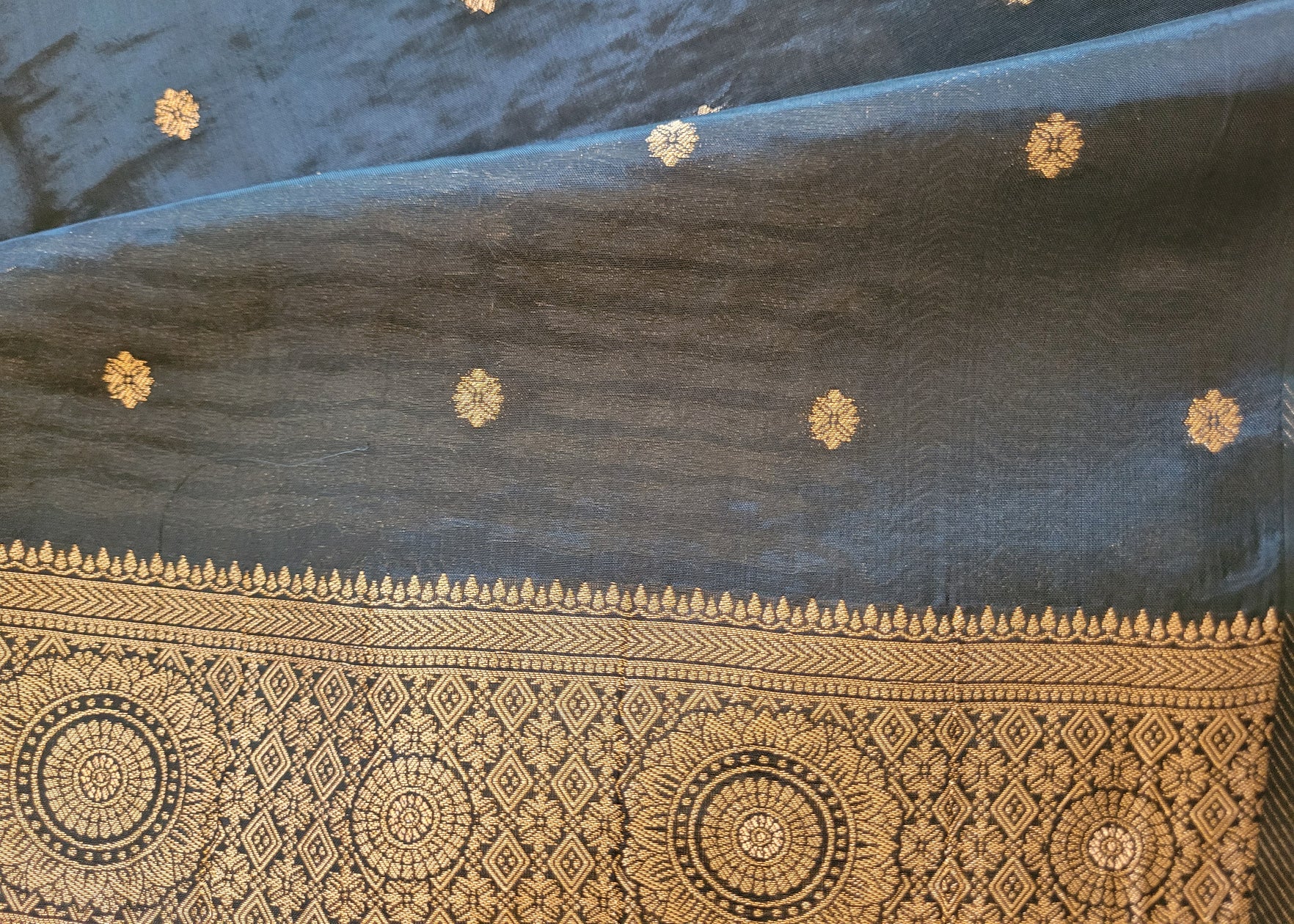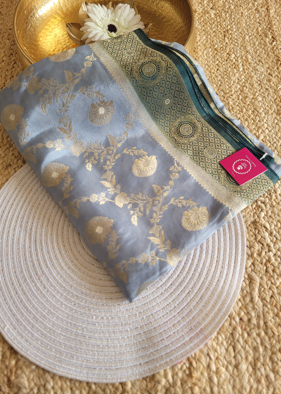 Silvery Grey And Bottle Green Mushru Silk Saree- Banaras
