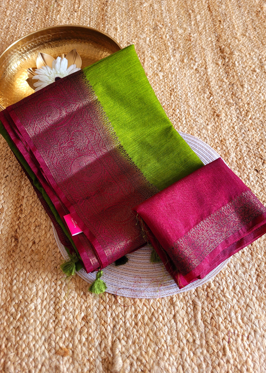Leaf Green And Maroon Semi Jute Silk Saree-Bengal