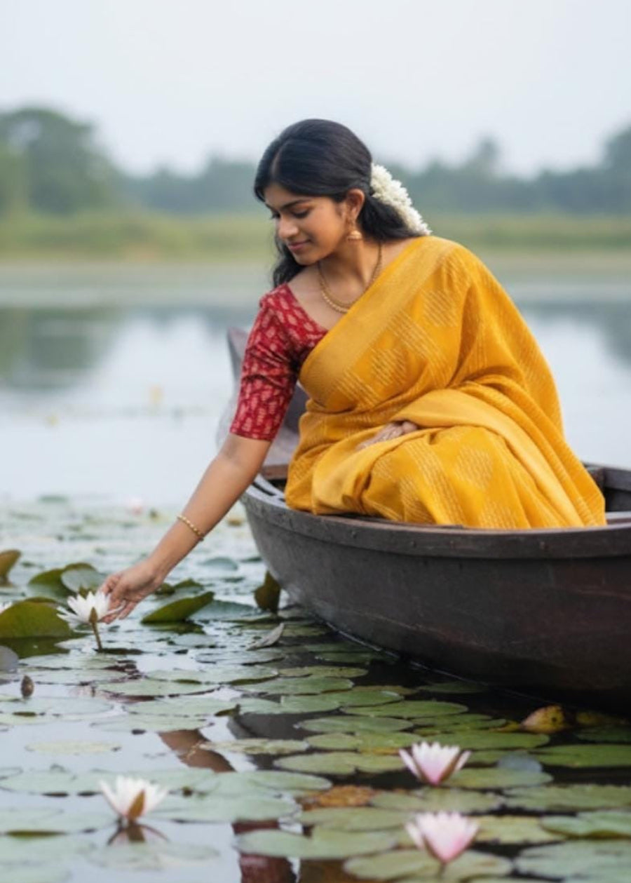 This Turmeric Yellow saree with sequins work is the best option for a festive look in economic range. Its bright hue adds warmth and energy, while the light weight and comfortable fabric ensures comfort throughout the day. Perfectly suited for festive occasions, this saree balances traditional charm with practical wearability for a refined and classy look.