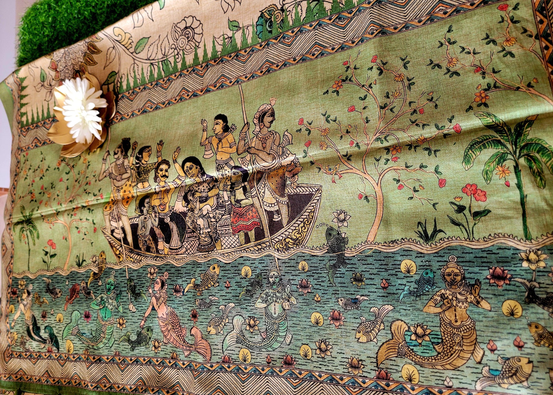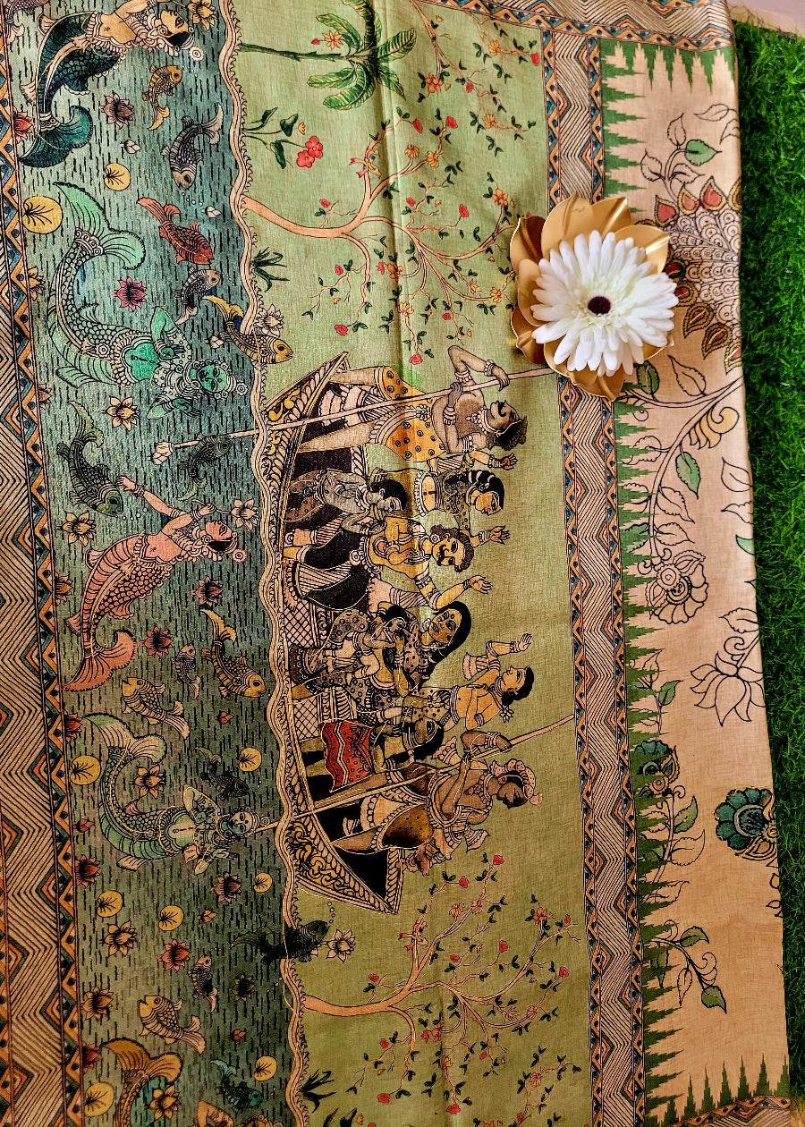 Cream and Sage Green Kalamkari Semi Silk With Maggam Work- Andhra