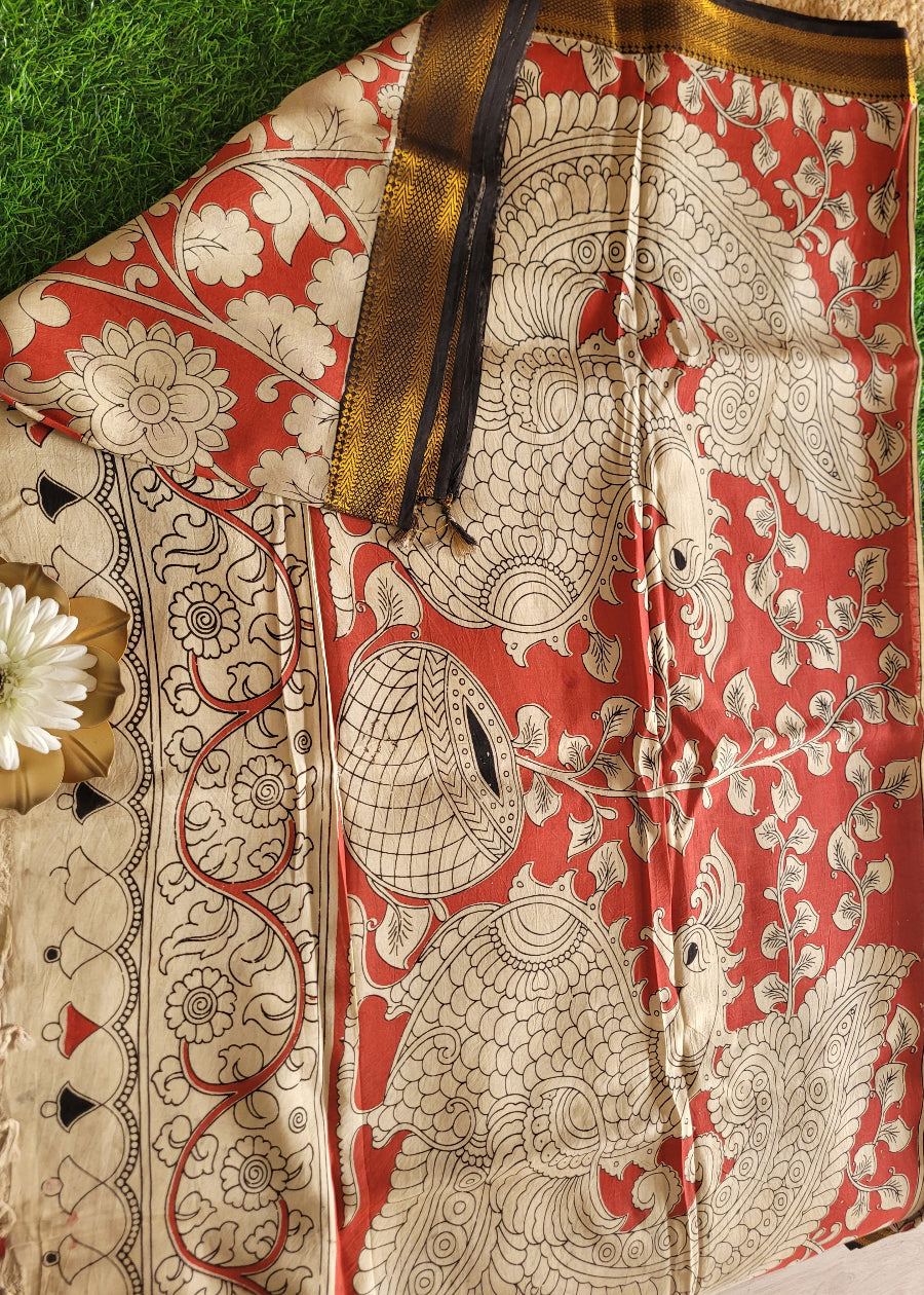 Celebrate elegance with this Semi Silk Saree in Floral Kalamkari design and Nizam borders in Brick Red and Black, from Andhra. The delicate design combined with graceful kalamkari peacocks on pallu adds a touch of artistry and tradition to your look. Perfect for festive occasions and special events, this saree offers a comfortable drape and timeless charm, making it a standout choice for your ethnic wardrobe.