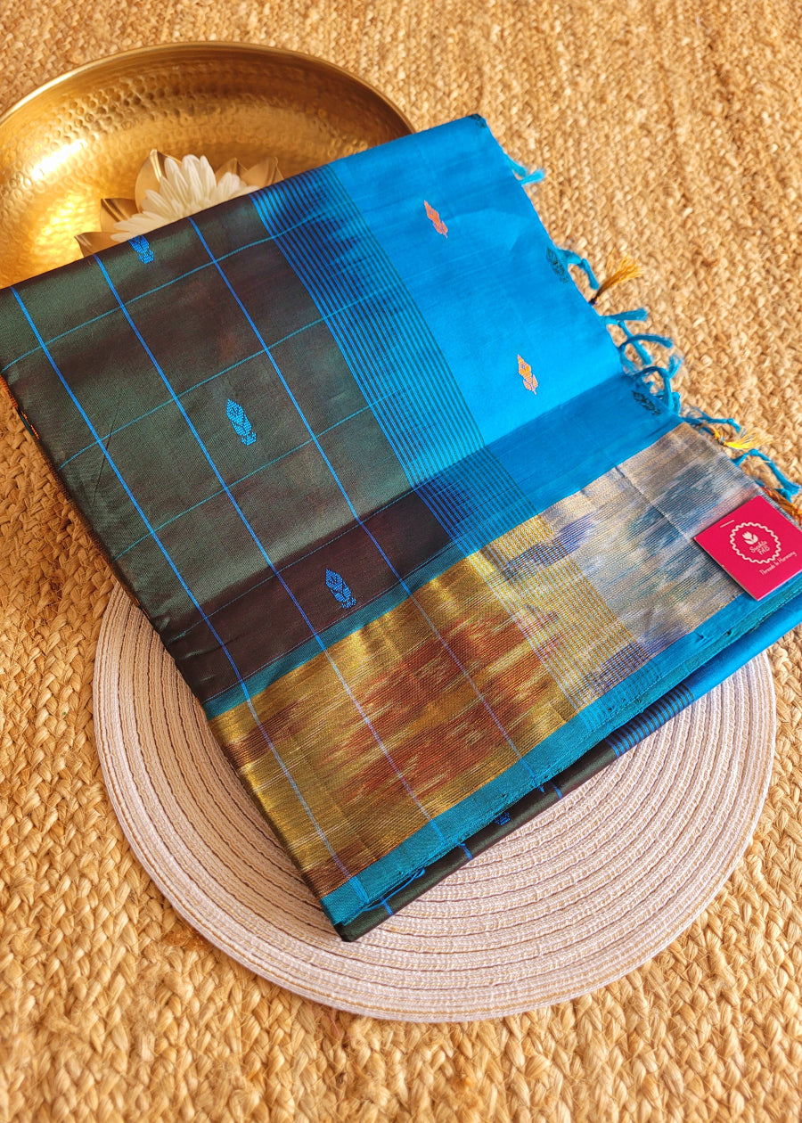 Checked Design Bottle Green And Blue Silk Cotton Saree-TN