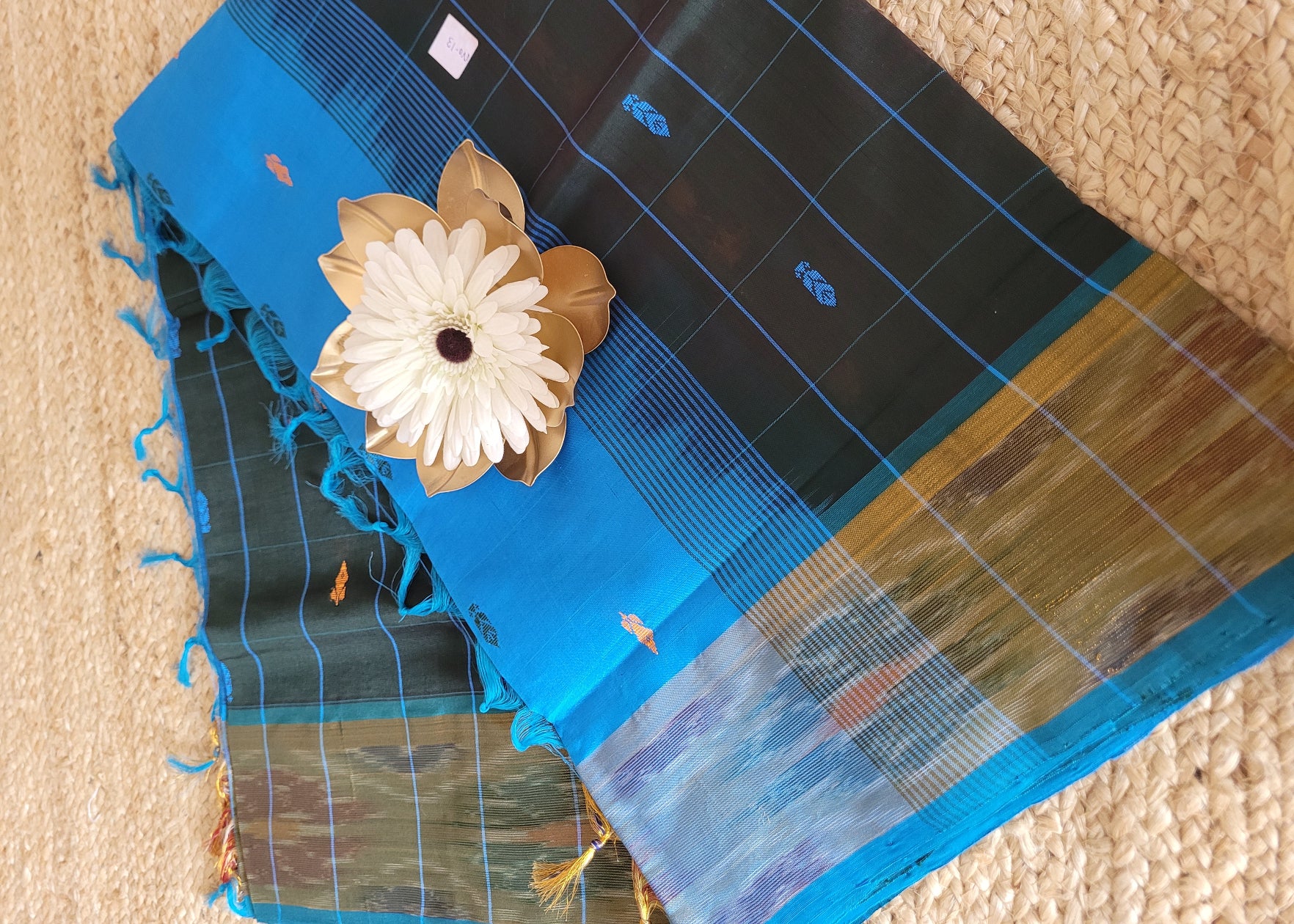 Experience the perfect blend of tradition and comfort with this saree in Bottle Green and Blue. Body has checks all over with woven buttas in it . With the classy Pochampally borders, it gives the quintessential Indian traditional look. Crafted from silk cotton fabric, this saree offers a luxurious sheen while remaining breathable and easy to drape. Its rich colors and elegant texture make it ideal for festive occasions and everyday wear alike, ensuring you stand out with grace and style. Elevate your wardrobe with this timeless piece that combines classic charm with modern comfort.