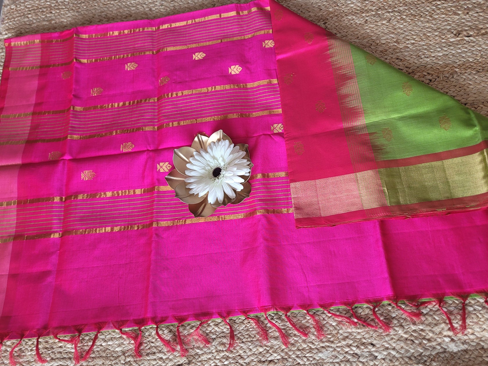 Add a burst of sunshine to your wardrobe with the TN Silk Cotton Saree in light Green and dark Pink with golden buttas on body. This saree beautifully blends the softness of cotton with the subtle sheen of silk, ensuring comfort and elegance throughout the day. Its vibrant colors and graceful drape make it perfect for festive occasions or casual outings, helping you make a confident and stylish statement wherever you go. Embrace tradition with a fresh, lively twist.